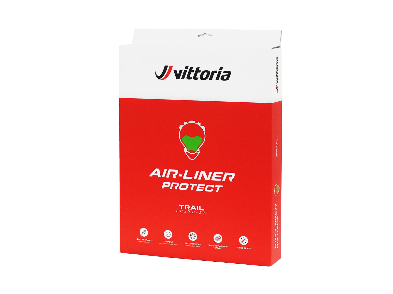 Wkładka AirLiner Protect Trail dostępna jest w rozmiarze 29x2.1-2.6. Jest kompatybilna z obręczami o szerokości od 26 mm do 33 mm oraz z dowolnym rodzajem uszczelniacza. AirLiner Protect Trail należy używać wyłącznie w połączeniu z oponami bezdętkowymi i wielokierunkowymi zaworami bezdętkowymi. Opakowanie AirLiner Protect Trail zawiera jedną wkładkę i jeden zawór Vittoria Green Multiway Tubeless o długości 40 mm.