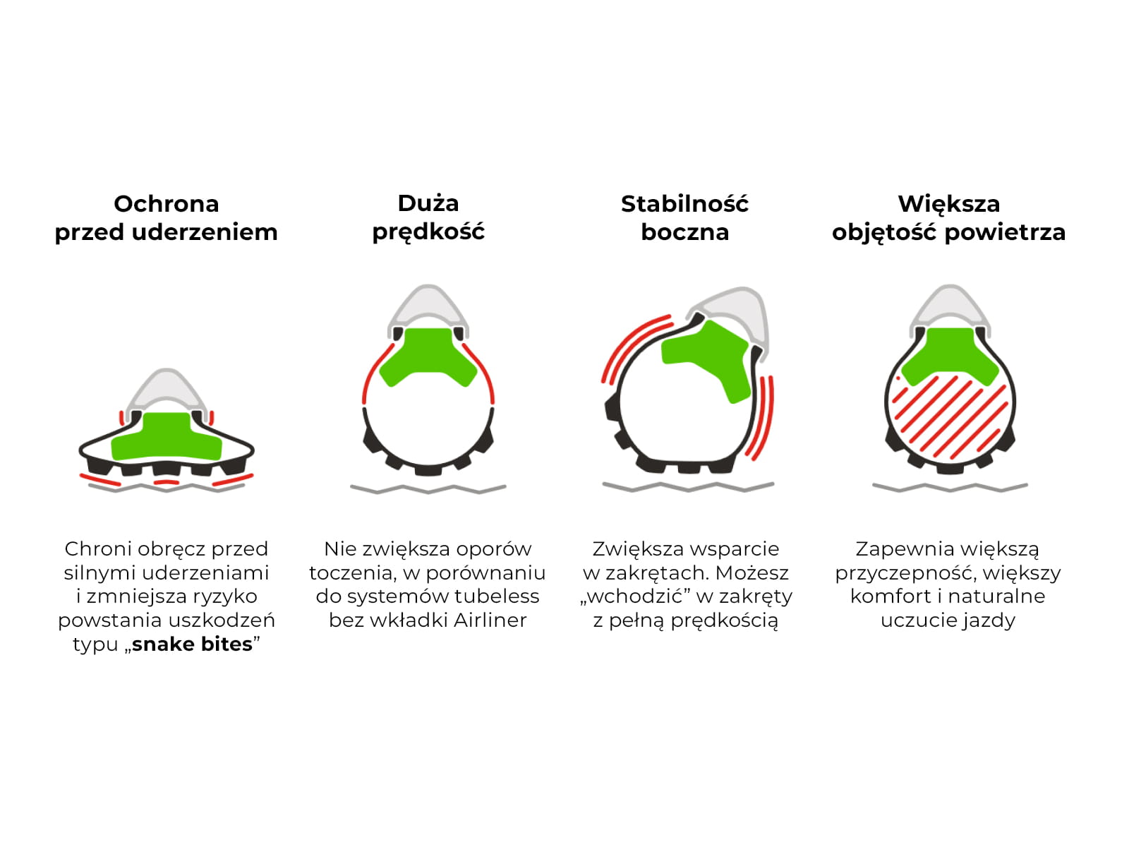 Opona jest jedynym punktem styku rowerzysty, roweru i podłoża; jest to zatem pierwszy element, który absorbuje uderzenia podczas jazdy w terenie. AirLiner Protect Trail maksymalizuje ochronę przed przebiciem opony. Stopniowa kompresja pianki pozwala na ekstremalne pochłanianie wstrząsów i zapobiega przebiciom opony spowodowanym silnymi uderzeniami o ścianki obręczy.