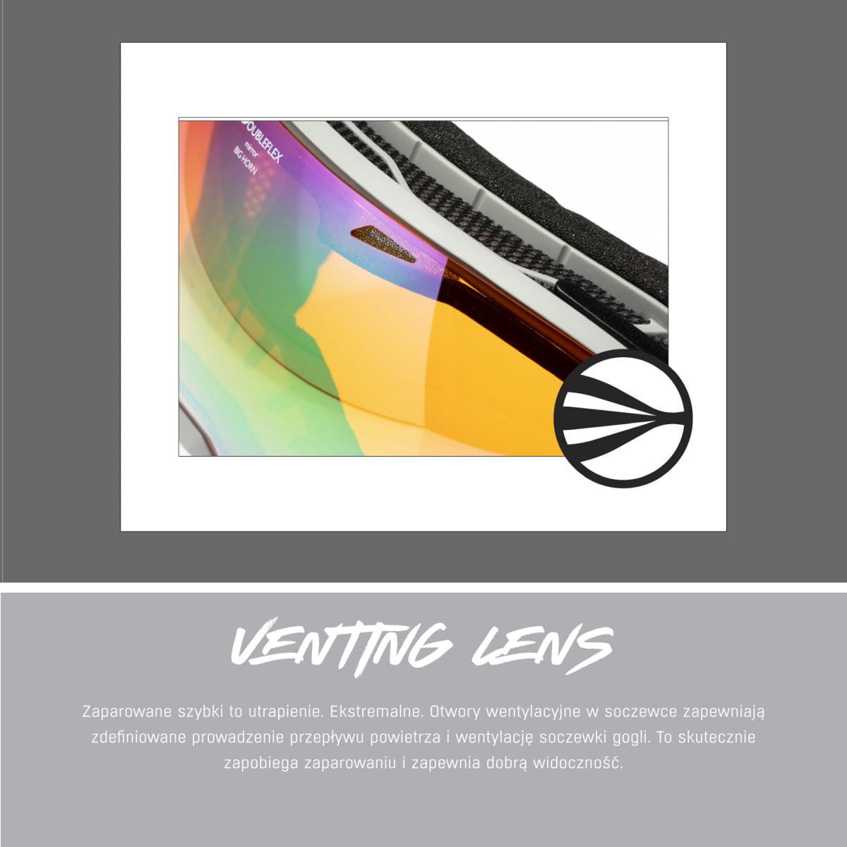 Gruba soczewka zapewnia optymalną widoczność i maksimum stylu. Wewnętrzne cechy również zwyciężają: Elastyczna, komfortowa i bezszkieletowa oprawka, pasywny otwór wentylacyjny w połączeniu z haczykami na pałąku. Niezwykle duże pole widzenia i gotowość do OTG (zaprojektowane tak, aby pasowały do większości okularów korekcyjnych).