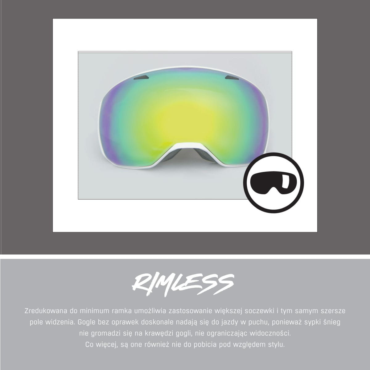 Gruba soczewka zapewnia optymalną widoczność i maksimum stylu. Wewnętrzne cechy również zwyciężają: Elastyczna, komfortowa i bezszkieletowa oprawka, pasywny otwór wentylacyjny w połączeniu z haczykami na pałąku. Niezwykle duże pole widzenia i gotowość do OTG (zaprojektowane tak, aby pasowały do większości okularów korekcyjnych).