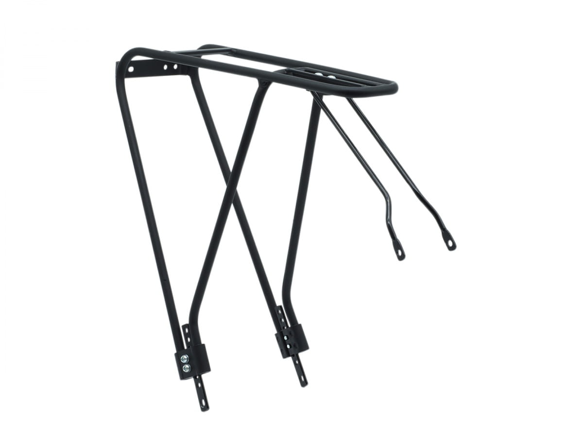 Bagażnik tylny wykonany ze stopu aluminium 6061-T6. Uchwyty o regulowanej wysokości umożliwiają zastosowanie tego bagażnika do rowerów z kołami o rozmiarze 26"-29" oraz 700c. Uchwyt do montażu lampy tylnej. Wymiary górnej powierzchni: 115-85 x 330 mm. Maksymalny udźwig: do 25 kg. Waga: 570 g. Kolor: czarny. Zestaw nie zawiera śrub montażowych do ramy.