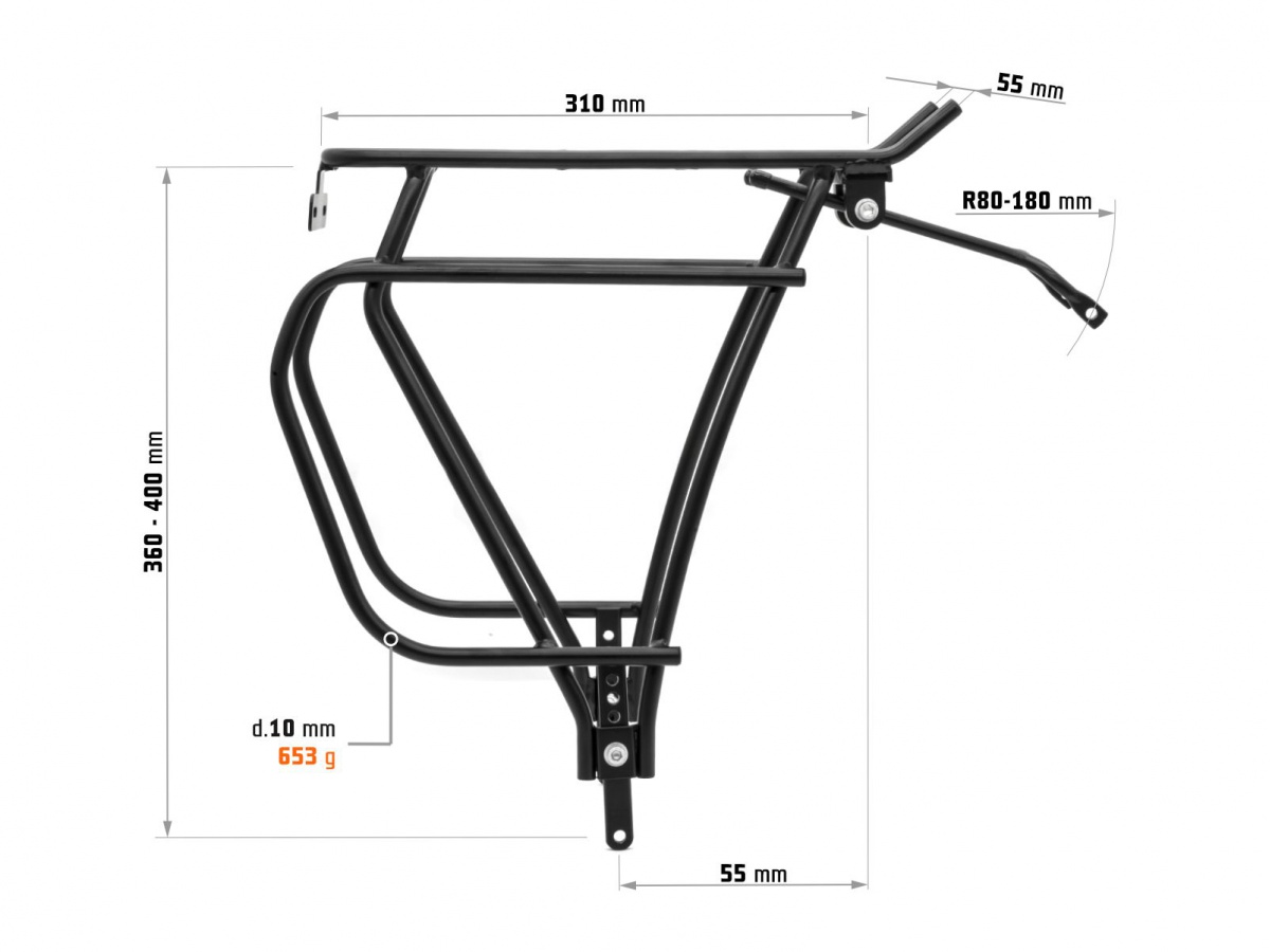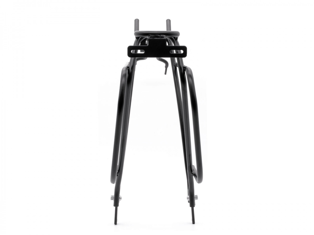 Bagażnik tylny wykonany ze stopu aluminium 6061-T6. Precyzyjne spawanie we wszystkich kluczowych punktach konstrukcyjnych. Uchwyty o regulowanej wysokości umożliwiają zastosowanie tego bagażnika do rowerów z kołami o rozmiarze 24"-29". Wymiary powierzchni ładunkowej: 310 x 70 mm. Płyta montażowa do tylnego oświetlenia. Maksymalny udźwig: do 25 kg. Waga: 653 g. Przetestowany zgodnie z normą ISO11243. Kolor: czarny. Zestaw nie zawiera śrub montażowych do ramy.