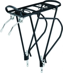 Bagażnik rowerowy o regulowanej wysokości. Wykonany z rurek aluminiowych. Sprężyna mocująca. Boczne pręty zapobiegające ocieraniu się sakw o szprychy.
