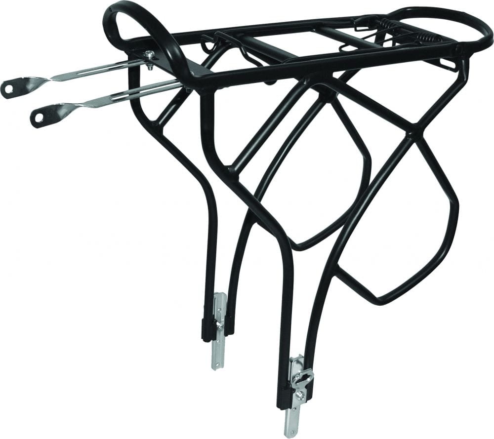 Bagażnik rowerowy o regulowanej wysokości. Wykonany z rurek aluminiowych. Sprężyna mocująca. Boczne pręty zapobiegające ocieraniu się sakw o szprychy.