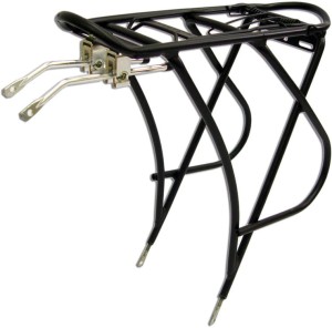 Bagażnik rowerowy o regulowanej wysokości. Wykonany z rurek aluminiowych. Sprężyna mocująca. Boczne pręty zapobiegające ocieraniu się sakw o szprychy.