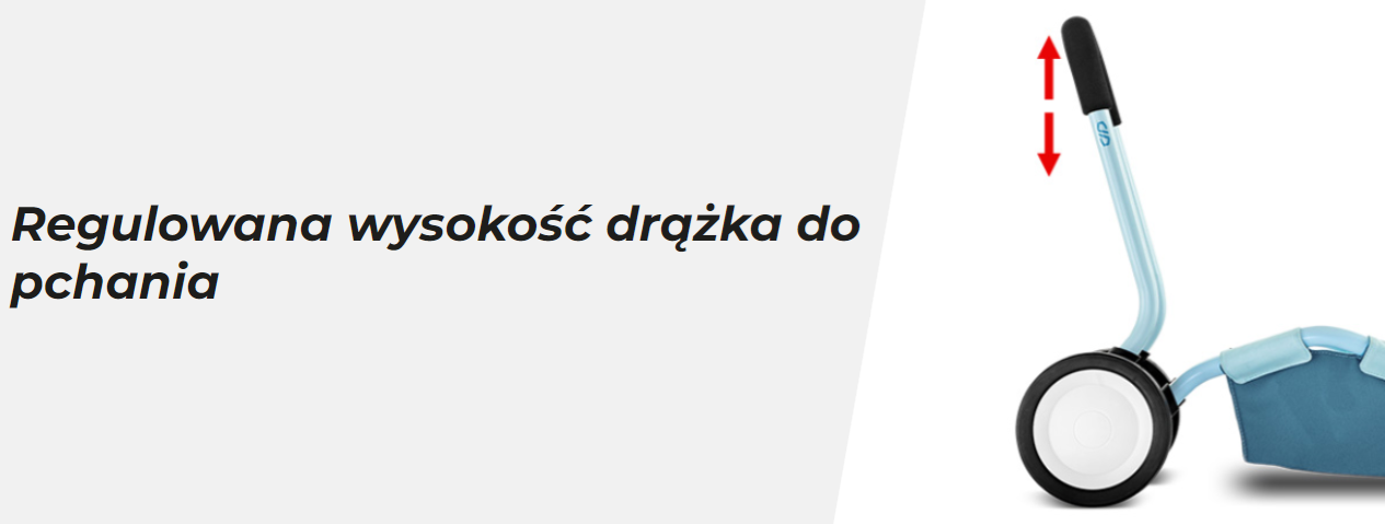 Drążek do pchania z regulacją wysokości pozwala na przyjęcie optymalnej pozycji chwytu, a indywidualnie regulowana blokada na jednym kole umożliwia optymalne dozowanie siły podczas pchania. W ten sposób możesz zachować kontrolę i pomóc dziecku poprawić równowagę.