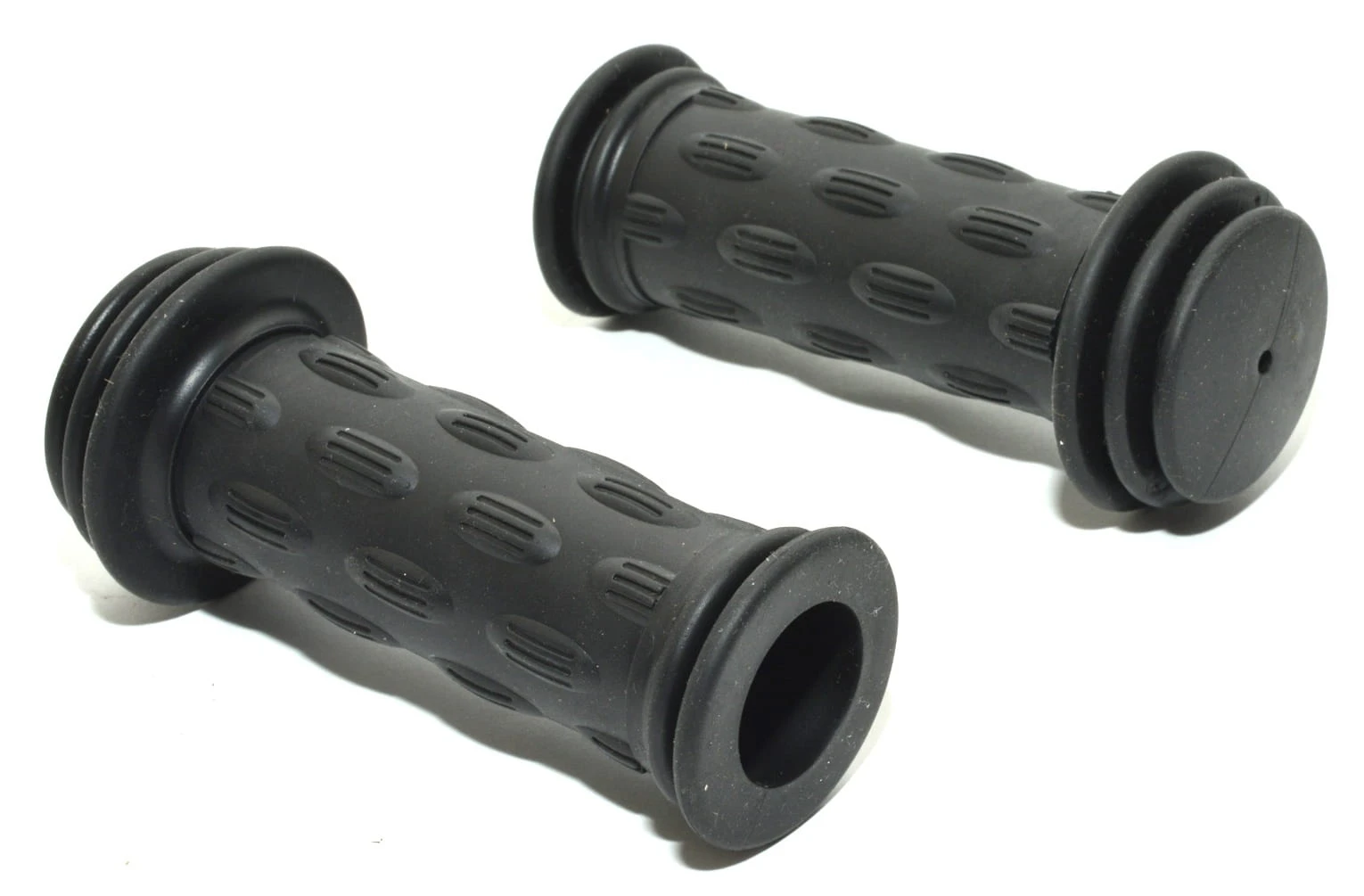 Chwyty kierownicy dziecięce ze specjalnym kołnierzem zabezpieczającym. Wykonane z gumy. Długość: 102 mm. Kolor: czarne