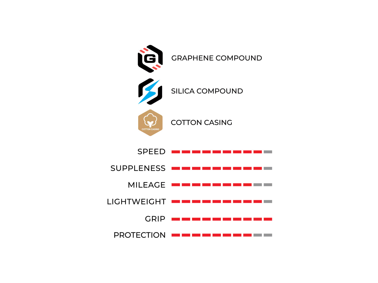 - połączenie dwóch mieszanek - Graphene oraz Silica - poprawiło wydajność opony CORSA PRO o 12% w przypadku szybkości, o 18% w przypadku odporności na przebicia, o 4% mniejsza waga w porównaniu z poprzednim modelem Corsa.