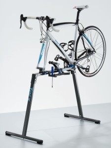 Stojak montażowy idealny na większe naprawy. Rower mocowany jest za przednie lub tylne haki ramy regulowanym uchwytem z jednej strony oraz stabilizowany plastikową rynienką z drugiej strony. Wyposażony w regulowaną, składaną podstawkę na narzędzia.