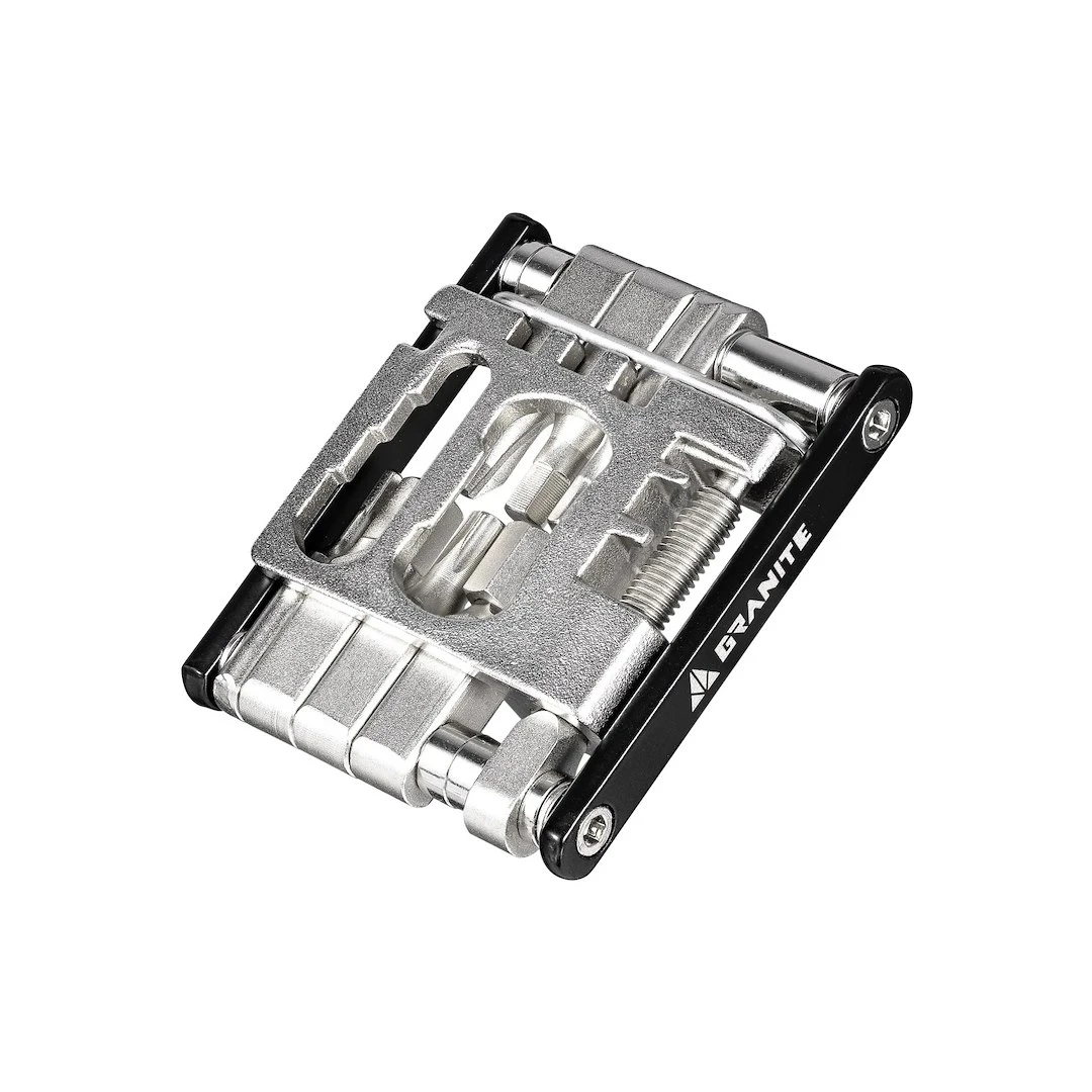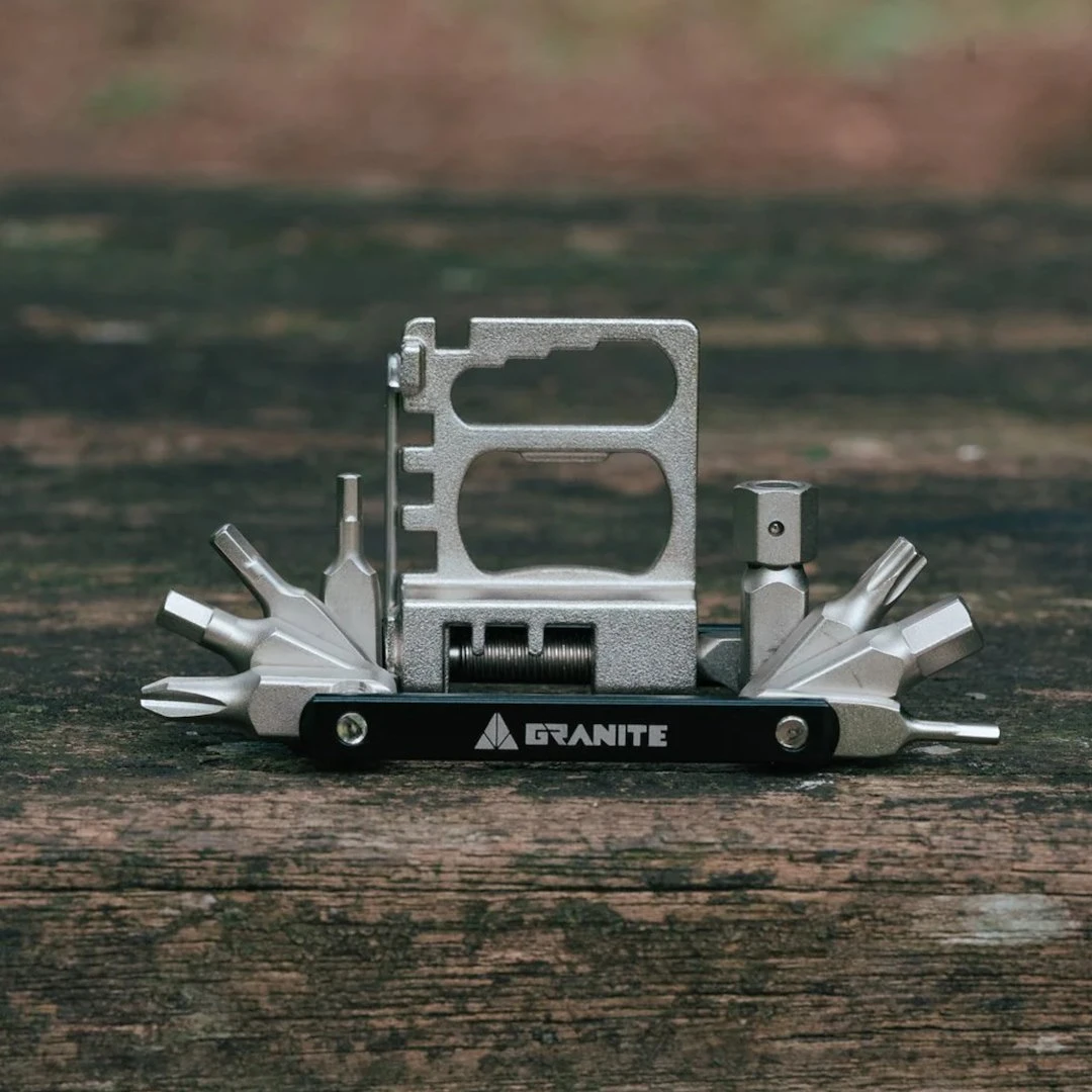 OPIS:Wszechstronny towarzysz przygódGranite Diverse 20 łączy maksymalną funkcjonalność w imponująco smukłej obudowie – zaledwie 11 mm grubości. To ultrakompaktowe narzędzie wielofunkcyjne, ważące zaledwie 104 g, zostało stworzone dla rowerzystów, którzy oczekują wszechstronności bez pokaźnych gabarytów. Z 20 niezbędnymi funkcjami – w tym bitami imbusowymi (2 do 8 mm), T25, wkrętakiem PH2, skuwaczem łańcucha i hakiem, kluczami do szprych, kluczami nasadowymi, a nawet otwieraczem do butelek – to kompleksowe rozwiązanie do napraw na szlaku i regulacji w trakcie jazdy.Precyzyjnie zaprojektowany i wystarczająco wytrzymały, by sprostać wielokrotnemu użytkowaniu, Diverse 20 udowadnia, że wysoka wydajność może być zawarta w smukłej obudowie. A kiedy jazda dobiegnie końca? Otwórz zimne piwo – zasłużyłeś na to.CECHY:Wymiary: 55 mm x 46 mm x 11 mm20 funkcji w jednym narzędziu – Zawiera klucze imbusowe 2 / 2,5 / 3 / 4 / 5 / 6 / 8 mm, T25, wkrętak PH2, skuwacz łańcucha, hak do łańcucha, klucze do szprych (13G/14G/15G/Shimano), klucze płaskie 4/6/8/10 mm oraz otwieracz do butelek.Pełny zakres napraw – Obejmuje narzędzia do naprawy łańcucha i regulacji szprych do napraw w podróży.Wysokiej wytrzymałości bity – bity ze stali chromowo-wanadowej (Cr-V) zaprojektowane z myślą o wielokrotnym użyciu i regulacji z wysokim momentem obrotowym.Dodatki gotowe na przygodę – Zintegrowany otwieracz do butelek do odświeżenia po jeździe.