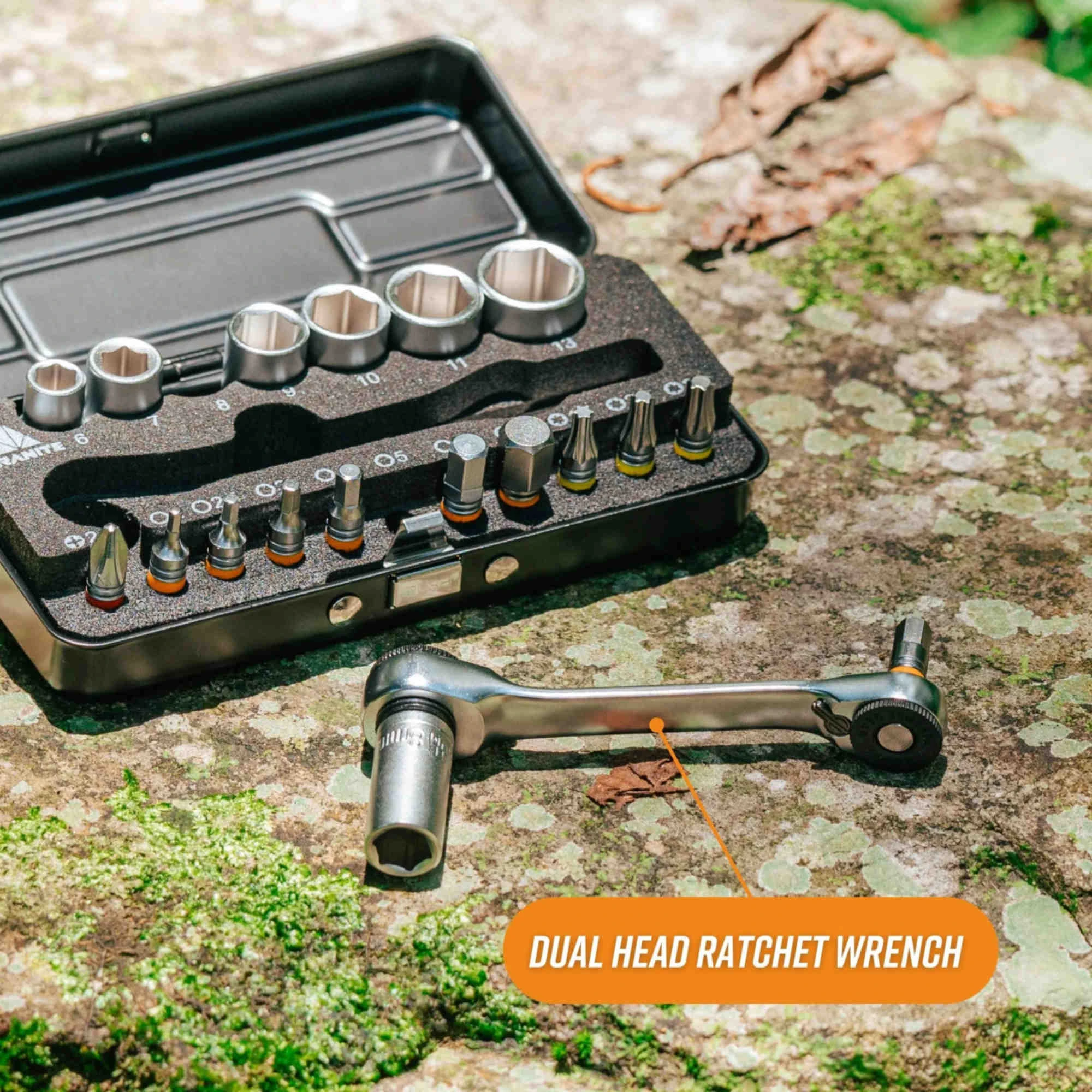 Kompaktowa, solidna metalowa skrzynka narzędziowa idealna do każdego zadania. Zawiera podwójną końcówkę imbusową i klucz grzechotkowy nasadowy, 7 nasadek imbusowych i 11 precyzyjnych końcówek narzędziowych, dzięki czemu masz odpowiednie narzędzie do każdego zadania.Wytrzymała i przenośna skrzynka narzędziowa Duet oferuje idealne połączenie wydajności i wygody zarówno dla profesjonalistów, jak i majsterkowiczów.Bity: 2 / 2,5 / 3 / 4 / 5 / 6 / 8 / T15 / T20 / T25 / PH2 / PrzedłużkaNasadki: 6 / 7 / 8 / 9 / 10 / 11 / 13Waga: 365 gFunkcjeUniwersalny klucz grzechotkowy: Zawiera podwójną głowicę do bitów sześciokątnych i nasadek z odwracalnym mechanizmem do szybkich zmian kierunku.Kompleksowy zestaw: Zawiera podwójny klucz grzechotkowy, pręt przedłużający, 7 nasadek sześciokątnych, 7 bitów sześciokątnych, 3 bity gwiazdkowe i bit krzyżakowy.Trwała konstrukcja: Wykonany z najwyższej jakości stali stopowej S2 dla zapewnienia doskonałej trwałości i długotrwałej wydajności.Solidna skrzynka narzędziowa: Umieszczona w solidnej metalowej skrzynce, zapewniająca uporządkowanie i ochronę narzędzi w celu łatwego transportu i przechowywania.