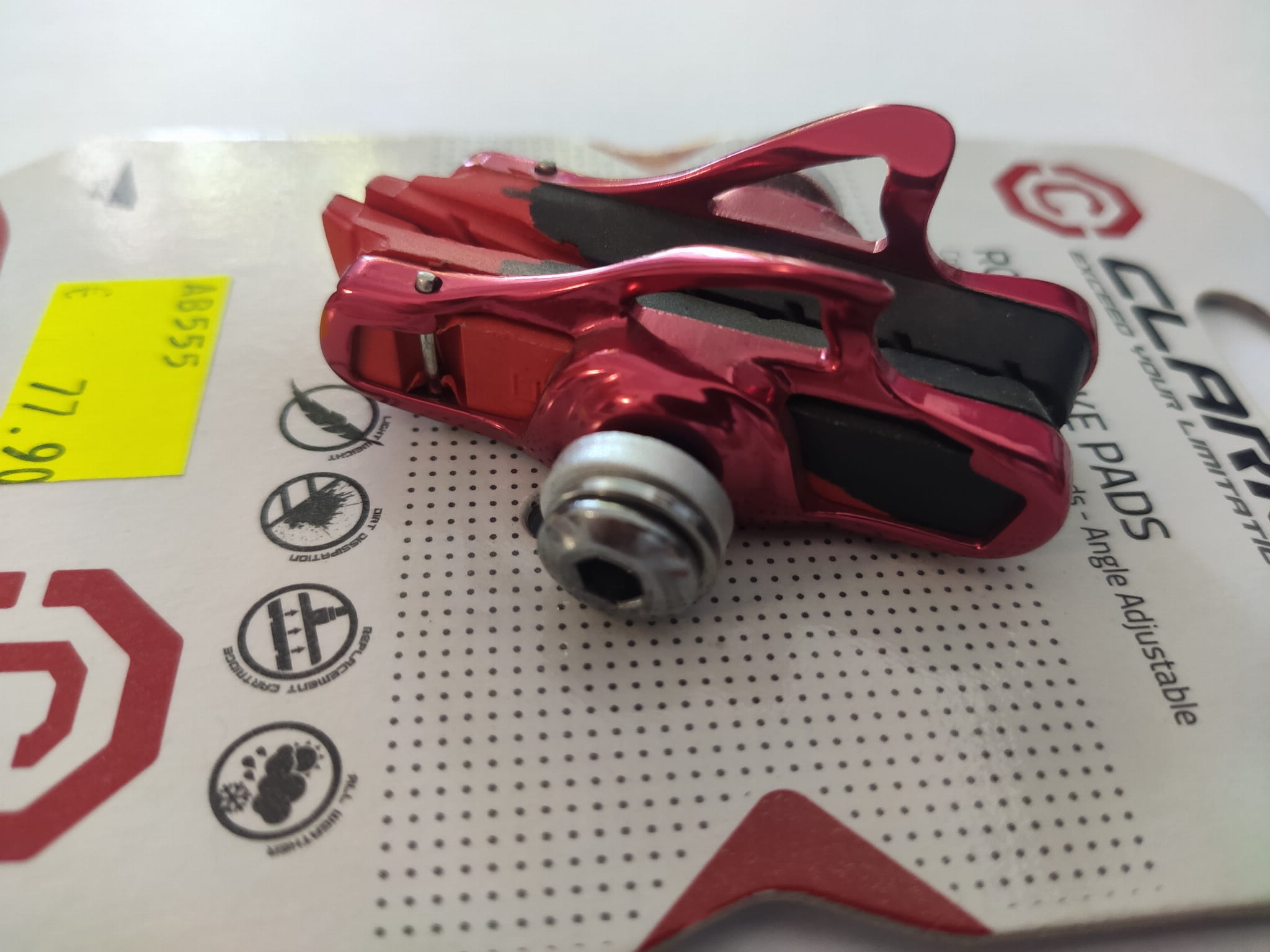 Wysokiej jakości klocki do hamulców szosowych. Wykonane z czarnej i czerwonej mieszanki gumy. Zapewniają krótszy dystans hamowania zarówno w warunkach suchych jak i mokrych. Obudowa z aluminium obrabianego CNC. Odprowadzające wodę nacięcia wydłużające żywotność klocków i obręczy.
