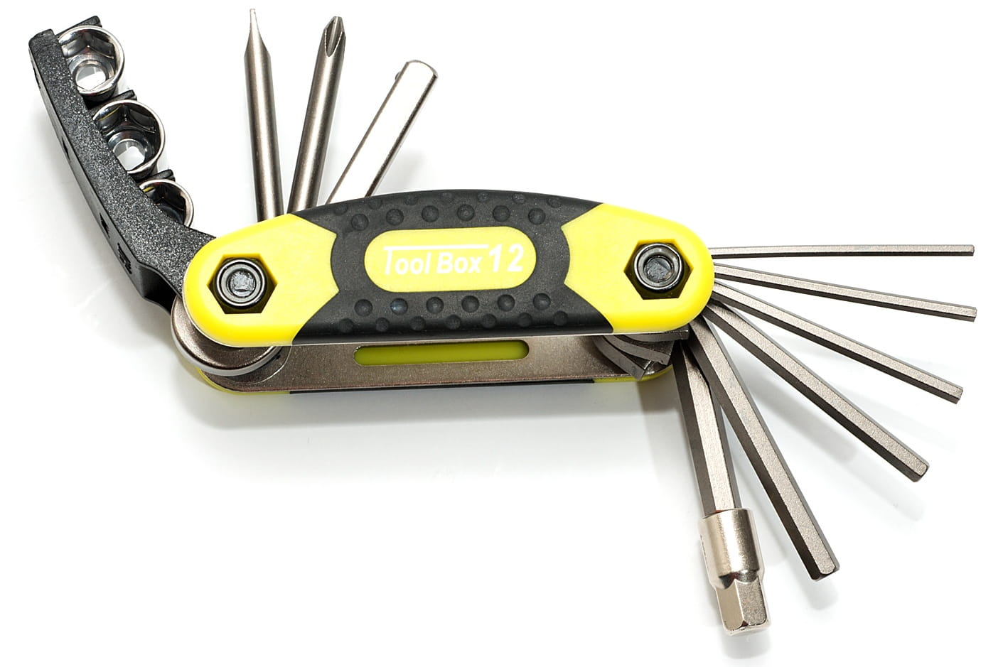 Kieszonkowy 12 funkcyjny zestaw kluczy w oprawie scyzoryka. Zawiera: klucze imbusowe 2/2,5/3/4/5/6/8 mm, śrubokręt krzyżowy i płaski, klucze nasadowe 8/9/10. Rozmiar: 32 x 97 x 30 mm. Waga: 230 g. Kolor: żółto-czarno-srebrne.