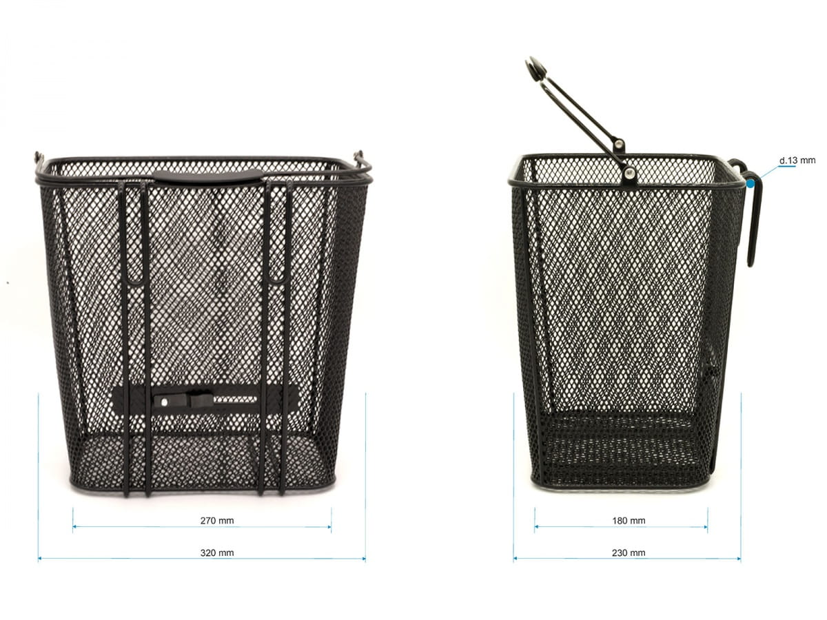 Pojemny i wytrzymały kosz montowany do bagażnika za pomocą haczyków i regulowanego systemu klipsów. Wykonany ze stali malowanej proszkowo. Łatwy do demontażu i przenoszenia. Wymiary: (góra) 32 x 23 cm, (dół) 27 x 18 cm. Wysokość 32 cm. Waga 1460 g.