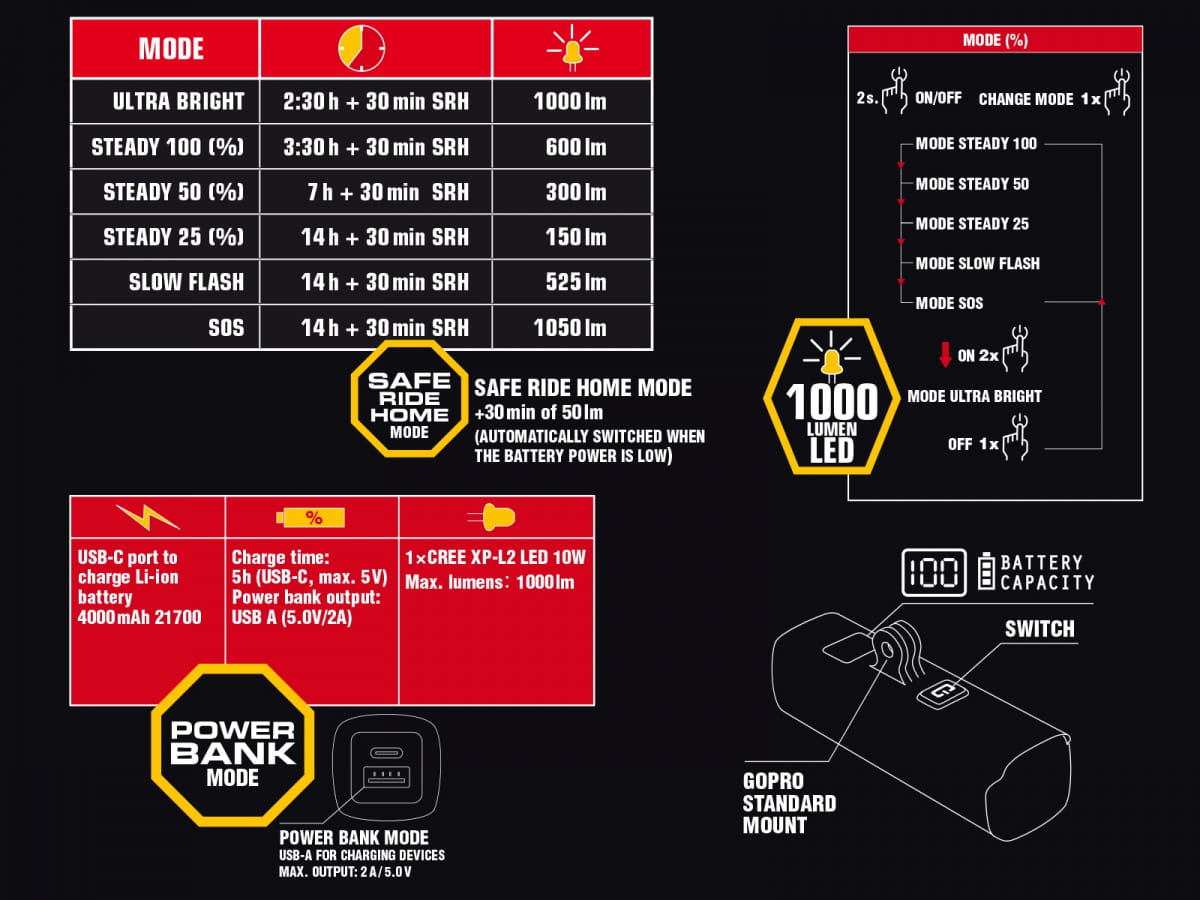 - Smart memory switcher – naciśnij i przytrzymaj przez 1 sekundę aby włączyć lub wyłączyć ostatni aktywny tryb. Naciśnij 2-krotnie aby włączyć tryb Ultra Bright o mocy 1000 lm.