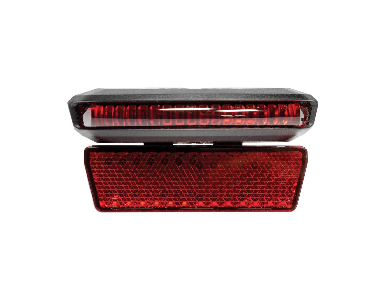 Lampa tylna z diodami COB LED. Kompatybilna z bateriami rowerów elektrycznych 6-12V. Funkcja Brake Light. Technologia Multi-Lens. Certyfikat StVZO. Szerokość montażu 50 mm. Widoczność 600 m. Waga 20 g.