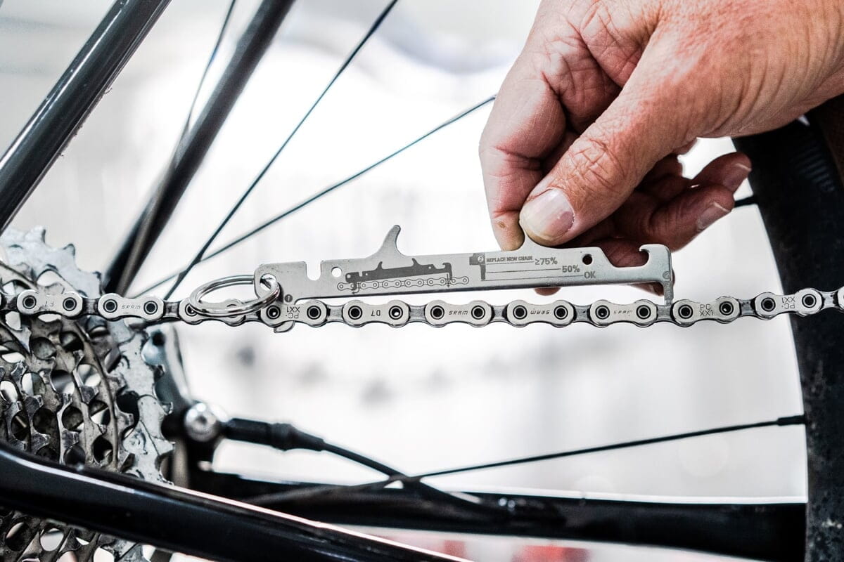 Zawieś go blisko stojaka naprawczego za pomocą dołączonego pierścienia, aby nigdy nie przejść zbyt długo bez ponownego sprawdzenia, czy łańcuch nie jest zużyty, po prostu nie zapomnij go odłożyć po pęknięciu zimnego za pomocą zintegrowanego otwieracza do butelek