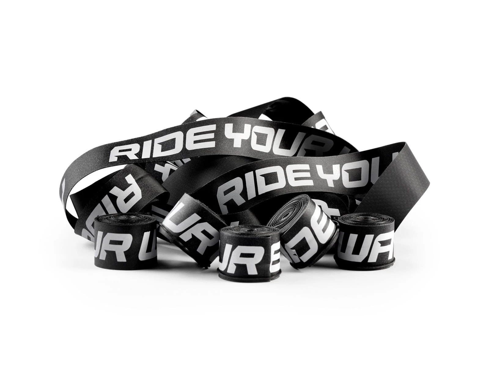 Trwała taśma na obręcz z impregnowanego nylonu z nadrukowanym logo Ride Your Way. Pakowana w sety po 4 szt.