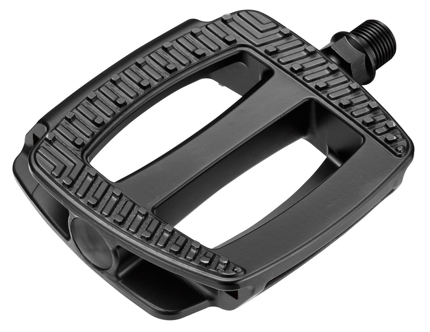 Pedały plastikowe z antypoślizgową powierzchnią. Korpus wykonany z tworzywa sztucznego. Oś wykonana ze stali Cr-Mo. Łożyska kulkowe. Wymiary: 107 x 100 x 24 mm. Waga: 300 g. Kolor: czarne.