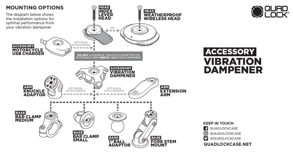 Tłumik drgań zawiera wszystko, czego potrzeba aby w kilka minut dało się go zintegrować się z mocowaniem motocyklowym Quad Lock.