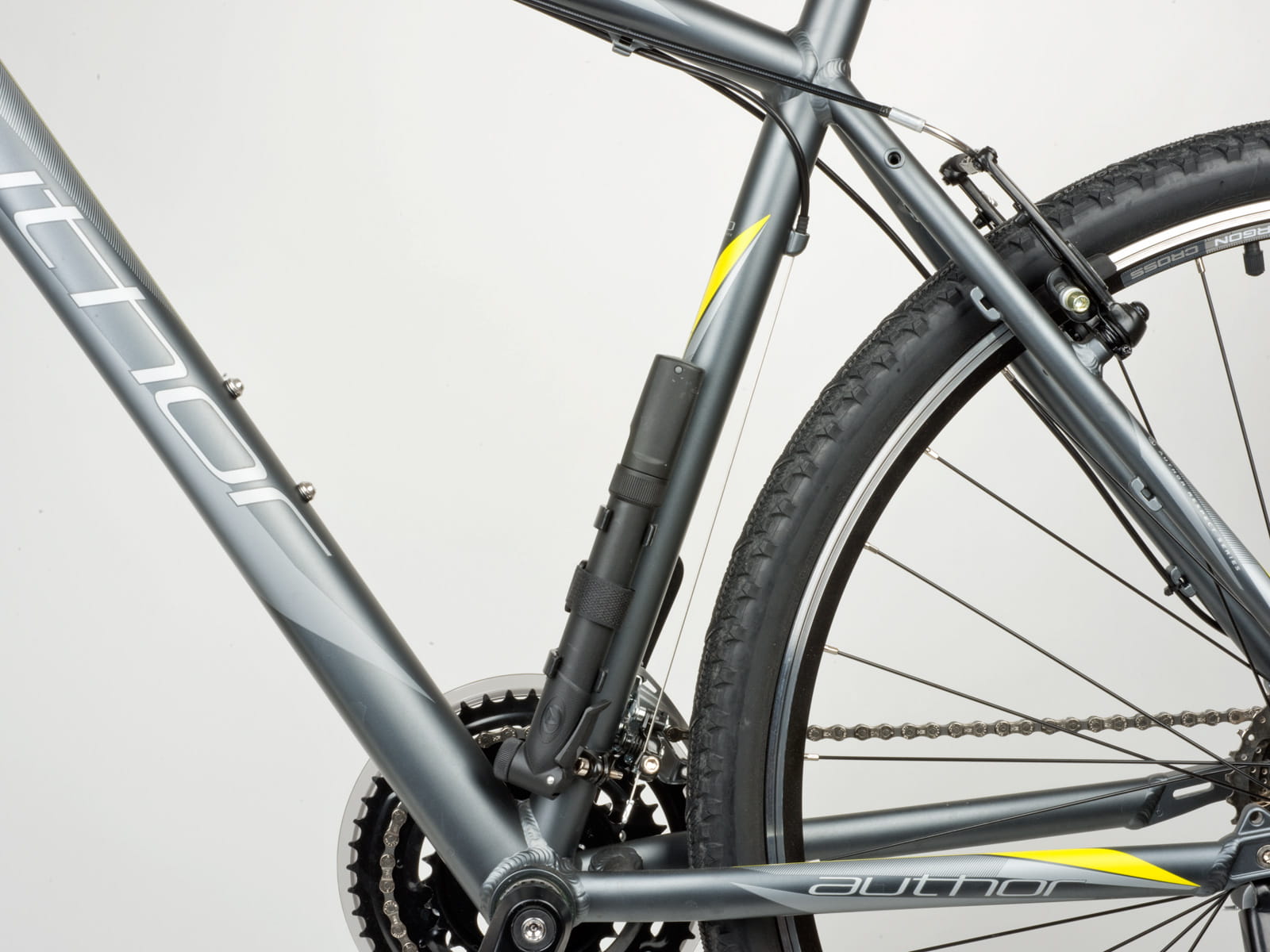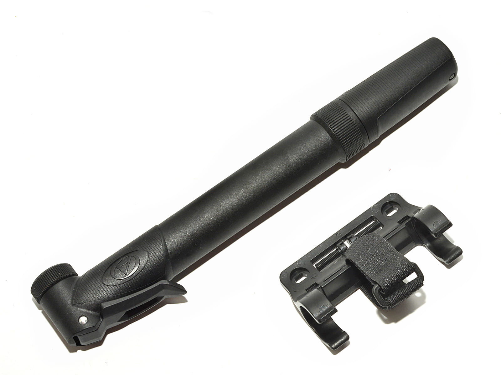 Pompka rowerowa przystosowana do wszystkich typów wentyli (przez przełożenie uszczelki). Wykonana z kompozytu. Ergonomiczna, poprzecznie ustawiana rękojeść. W komplecie uchwyt mocujący. Rozmiar: Ø 28 x 230 mm. Waga: 97g (z uchwytem).