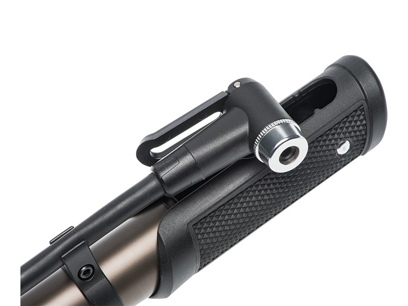 Opierając jeden koniec naszej pompki z klapką na ziemi, możesz używać obu rąk do stabilizacji i operowania rozkładanego uchwytu pompy.