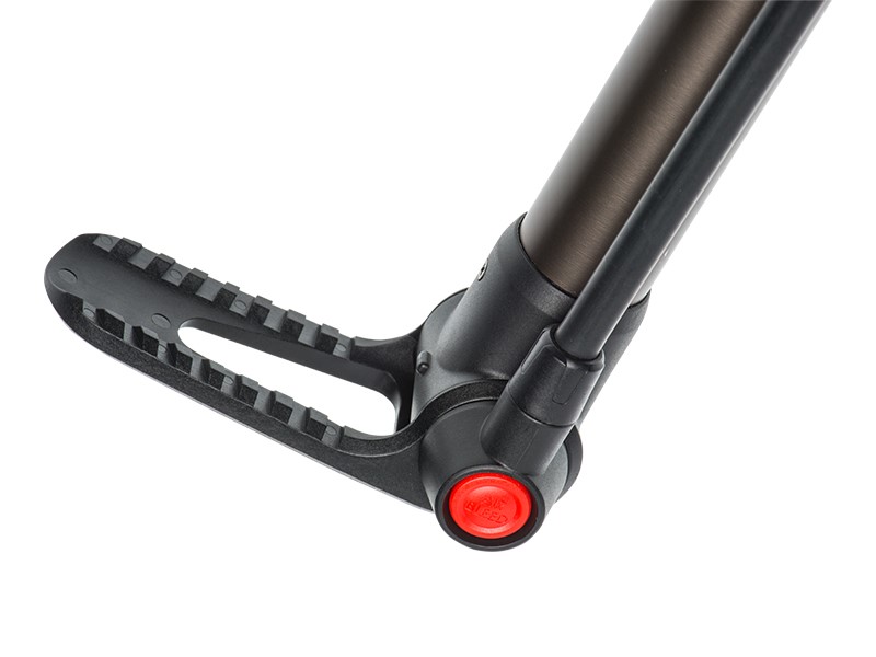 Wystarczająco mocna, aby napompować opony w rowerach górskich, szutrowych lub drogowych. Po prostu rozłóż uchwyt i podnóżek, zainstaluj głowicę Anyvalve na zaworze i napompuj. Użyj przycisku Airbleed na podstawie, aby ustawić żądane ciśnienie.