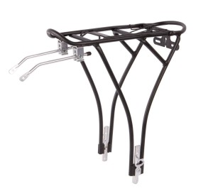 Lekki bagażnik rowerowy o regulowanej wysokości. Wykonany z rurek aluminiowych. Sprężyna mocująca.
