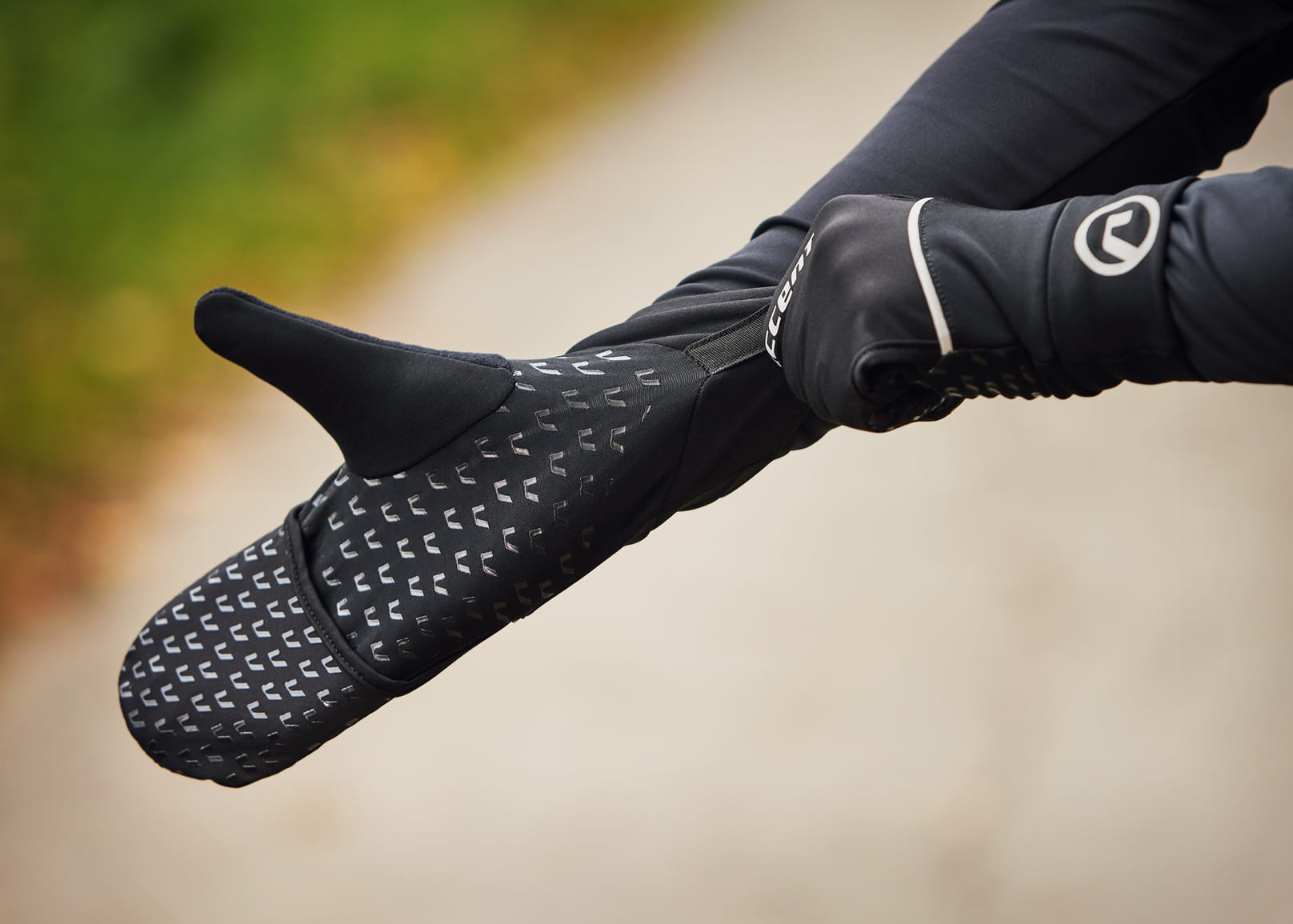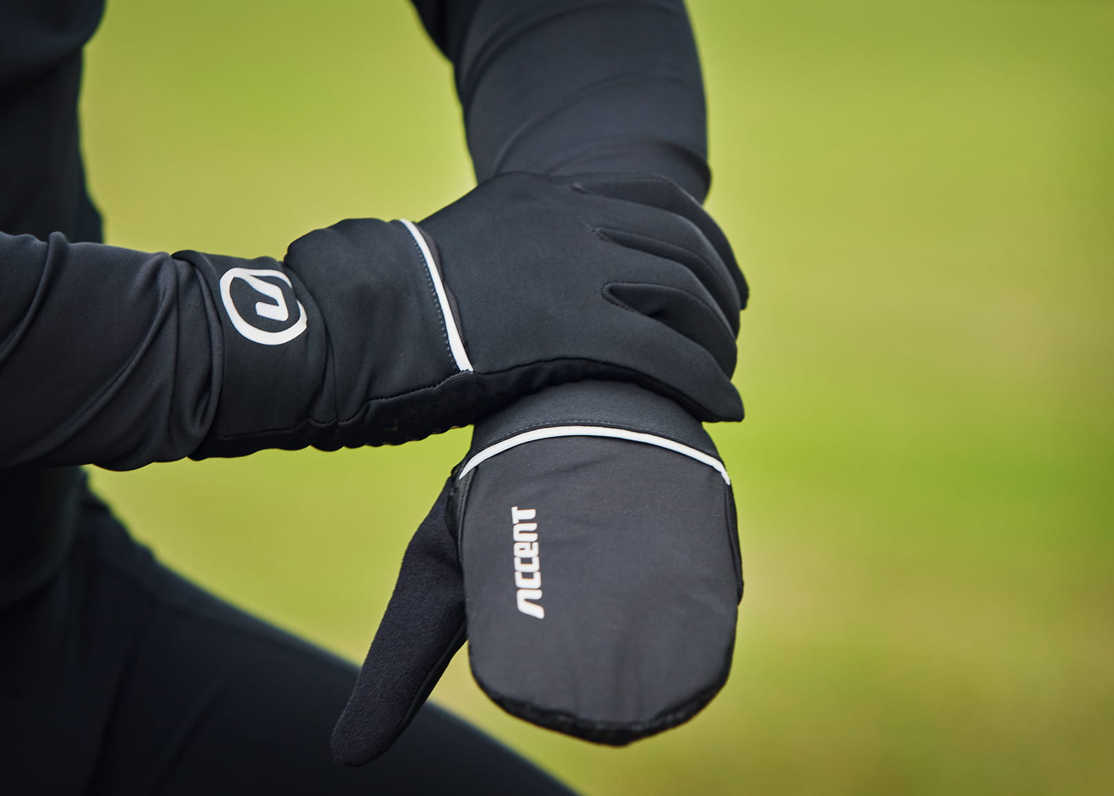 Ocieplane rękawiczki rowerowe wyposażone w specjalny pokrowiec na palce. Możesz naciągnąć ją na dłoń kiedy robi się chłodniej. Gdy nie ma takiej potrzeby, wystarczy schować materiał w kieszeni na wierzchu rękawiczki i można cieszyć się pełną swobodą ruchów palców. Wewnętrzna strona dłoni z silikonowym nadrukiem, który zapobiega ślizganiu się na kierownicy. Palec wskazujący wyposażony w końcówkę do korzystania z ekranów dotykowych np. smartfona czy licznika rowerowego. Elementy odblaskowe zwiększają bezpieczeństwo na drodze.