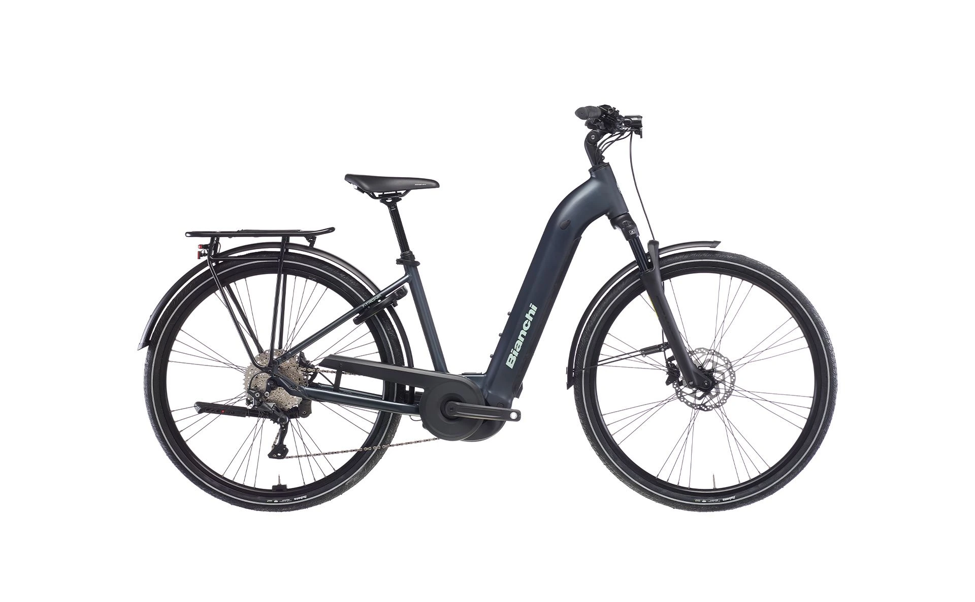 Rama Bianchi T-Tronik C wykonana z aluminium łączy lekkość, sztywność i elegancki design. Konstrukcja z wewnętrznym prowadzeniem przewodów oraz amortyzowanym widelcem o skoku 80 mm sprawia, że rower świetnie radzi sobie z nierównościami miejskich i szutrowych dróg. Rama jest kompatybilna z baterią 800 Wh, co pozwala na ewentualną rozbudowę w przyszłości.