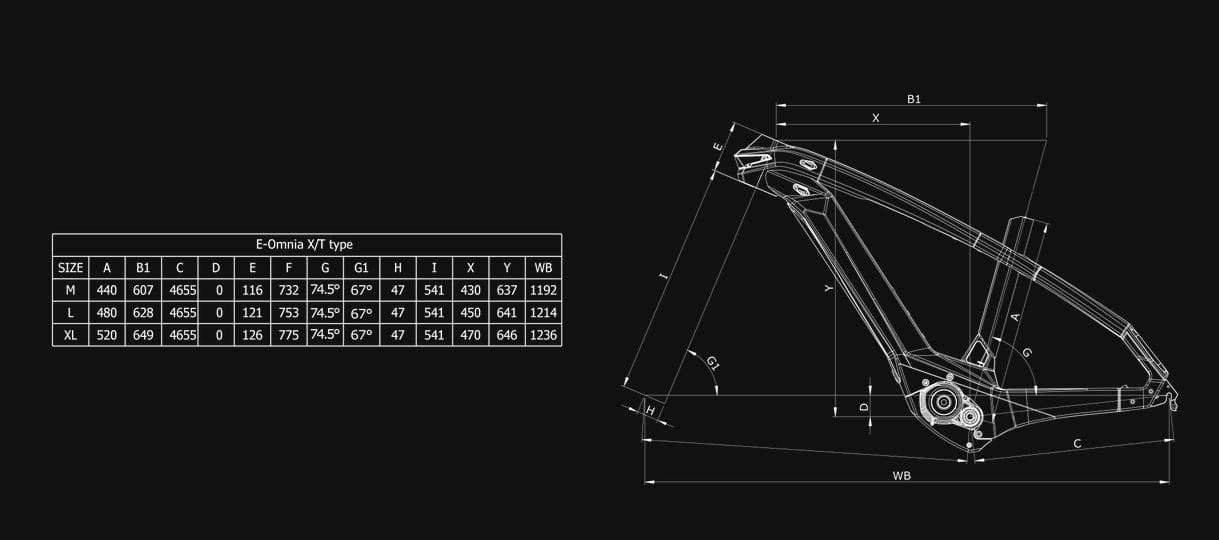 - Rama: E-OMNIA T-Type chain drive ALU sizes: 43-48-53 - 12x148mm thru-axle dropouts (special dropout for external derailleur) - Post mount 180 disc brake type - Internal cable routing in DT - Frame lock compatiblex - 625Wh compatible - custom rear carrier integr