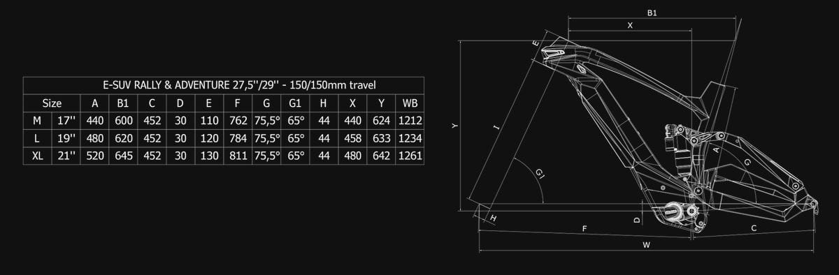 - Rama: e-SUV carbon sizes: 43, 48, 53 - 12x148 mm thru axle dropouts - Post mount 180 disc brake type - 160/150mm travel front - 150mm travel rear