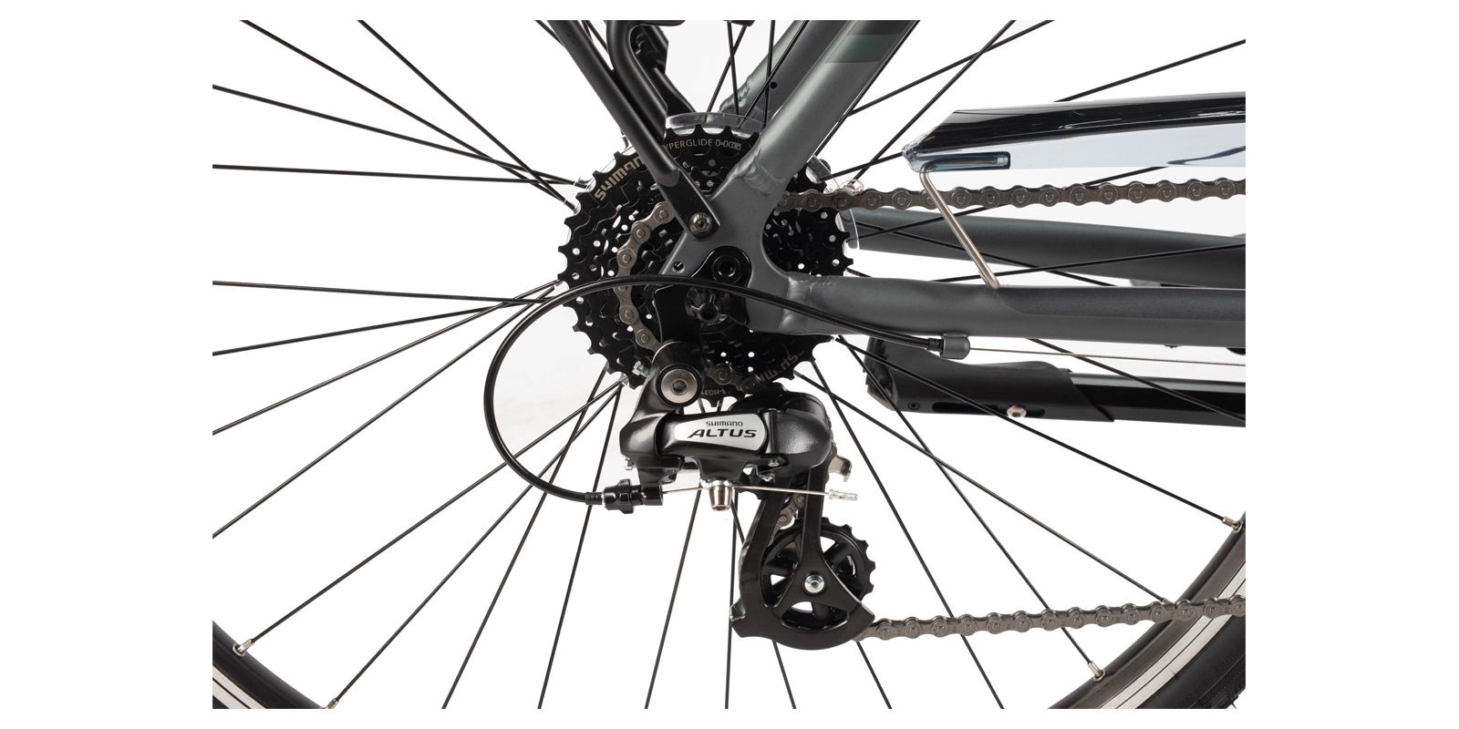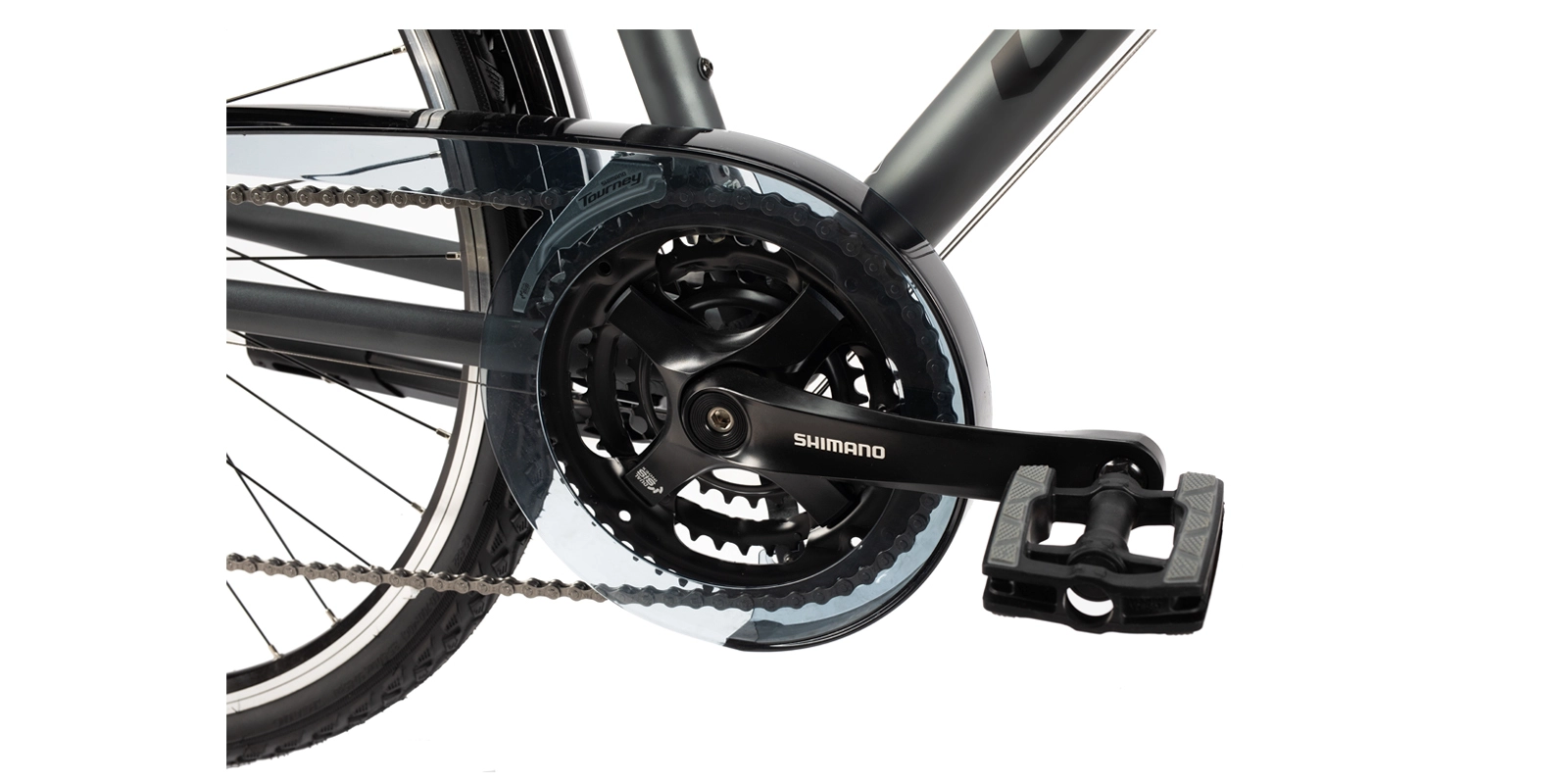 Kompletny napęd Shimano gwarantuje niezawodność i precyzyjną zmianę biegów w każdych warunkach. Trójrzędowy mechanizm korbowy Shimano TY501 (48/38/28T) oferuje szeroki zakres przełożeń, idealny zarówno do jazdy po asfaltach, jak i bardziej wymagających trasach. Tylna przerzutka Shimano Altus M310 oraz kaseta Shimano HG31 11–32T zapewniają płynną i responsywną pracę, a całość uzupełnia solidny łańcuch KMC Z8.3.