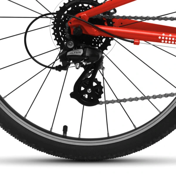 Rower został wyposażony w przerzutkę Shimano ALTUS 8-biegową oraz manetkę obrotową Shimano TOURNEY REVO SHIFTER, która działa lekko i precyzyjnie. Dzięki temu zmiana biegów jest intuicyjna i bezproblemowa, a młody rowerzysta może skupić się wyłącznie na przyjemności z jazdy.