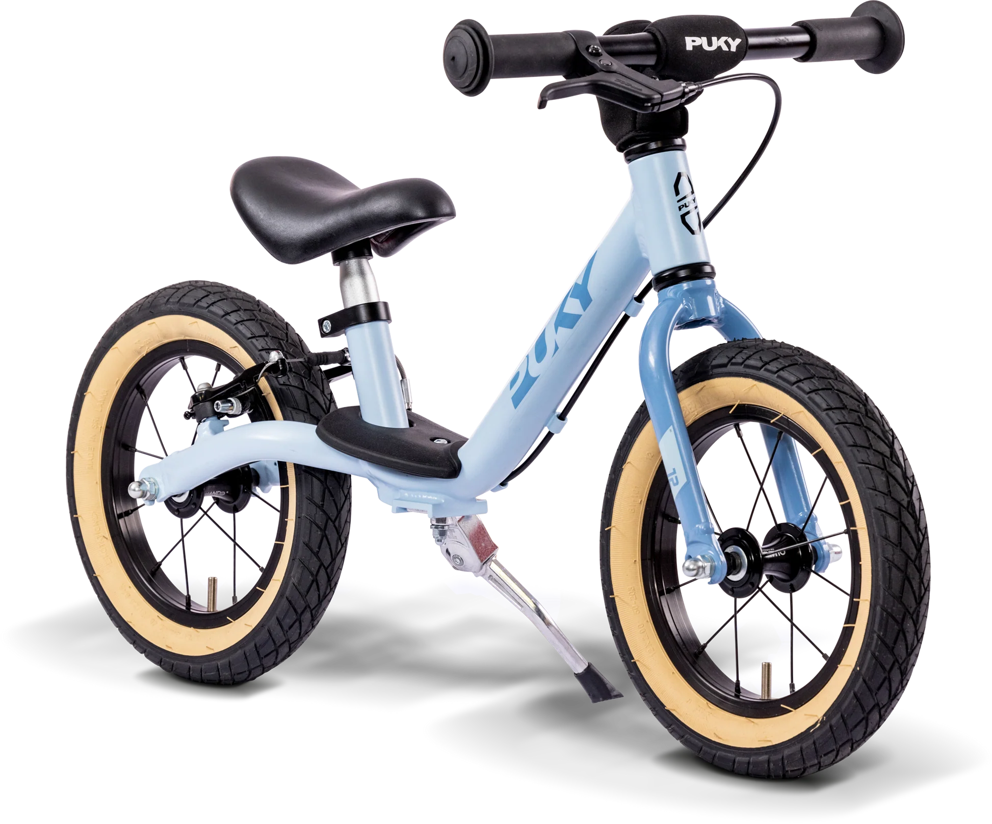 Rowerek wyposażono w bezpieczne chwyty kierownicy PUKY oraz miękką wyściółkę, które chronią dłonie i zapewniają wygodny pewny chwyt. 12-calowe opony pneumatyczne gwarantują bardzo dobrą przyczepność i komfort jazdy na różnych nawierzchniach, a prosty aluminiowy widelec zapewnia stabilność oraz precyzyjne prowadzenie. Odporna na wstrząsy powłoka proszkowa chroni konstrukcję przed uszkodzeniami, a składana podpórka boczna ułatwia parkowanie rowerka.