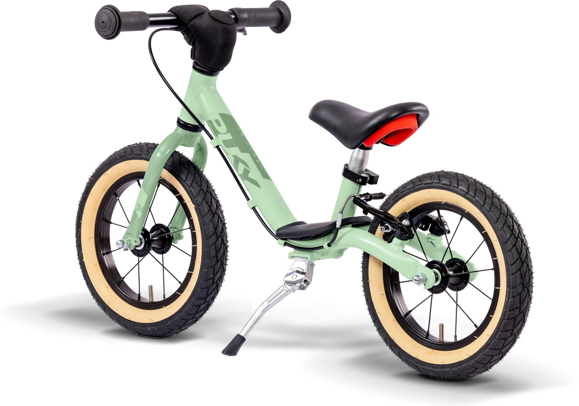 Rowerek wyposażono w bezpieczne chwyty kierownicy PUKY oraz miękką wyściółkę, które chronią dłonie i zapewniają wygodny pewny chwyt. 12-calowe opony pneumatyczne gwarantują bardzo dobrą przyczepność i komfort jazdy na różnych nawierzchniach, a prosty aluminiowy widelec zapewnia stabilność oraz precyzyjne prowadzenie. Odporna na wstrząsy powłoka proszkowa chroni konstrukcję przed uszkodzeniami, a składana podpórka boczna ułatwia parkowanie rowerka.