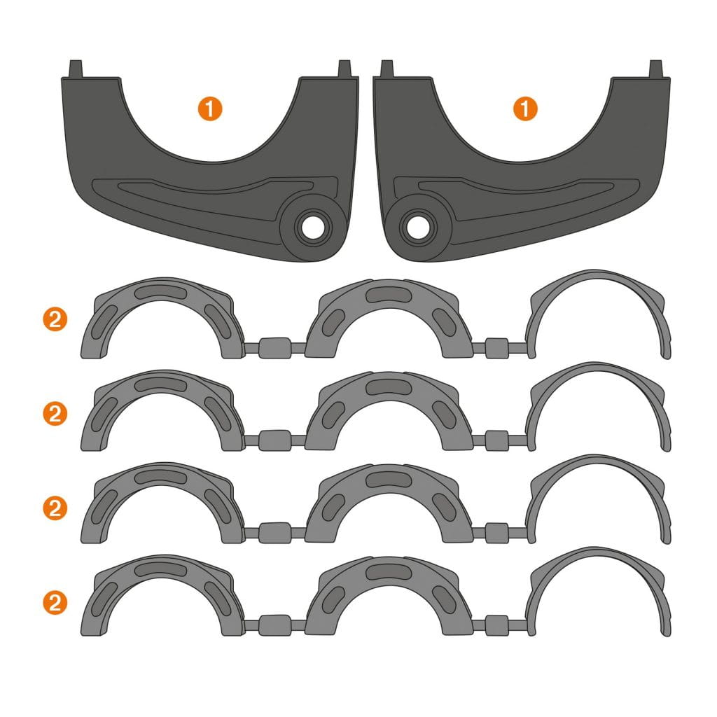 Zestaw składa się z czterech wkładek gumowych do obejmy, dwóch nowych obejm, czterech podkładek i odpowiednich śrub.