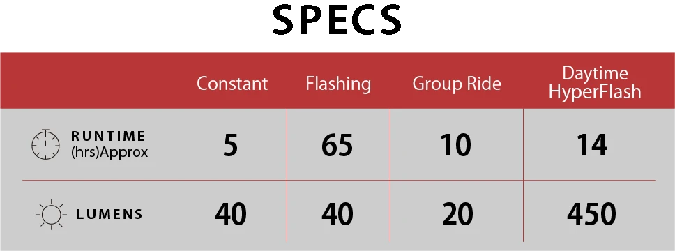 Czas świecenia: ciągły – 5 godz. (40 lumenów), migający – 65 godz. (40 lumenów), GroupRide – 10 godz (20 lumenów), HyperFlash – 14 godz. (450 lumenów).