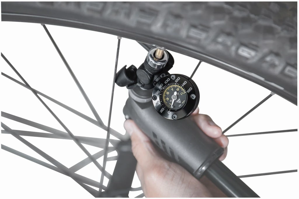Miniaturowy ciśnieniomierz można zamocować między pompką a zaworem w celu odczytu ciśnienia podczas pompowania lub używać samodzielnie. Zapewnia odczyty ciśnienia do 160 psi / 11 barów. Obrotowy wskaźnik jest czytelny, a głowica wspołpracuje z zaworami Presta, Schrader lub Dunlop* w rowerach / motocyklach / oponach samochodowych lub amortyzatorach. Dźwignia Thumb Lock zapewnia hermetyczne uszczelnienie. Przycisk zwalniający powietrze umożliwia precyzyjne dostrojenie ciśnienia.