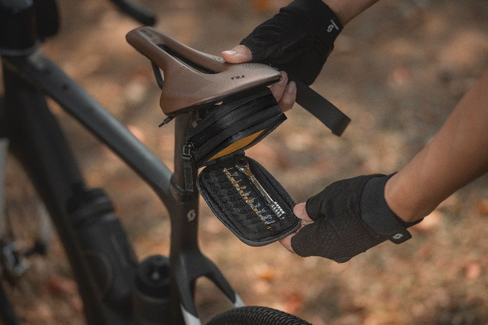 Ultra kompaktowa torba podsiodłowa jest schowana pod siodłem za pomocą rzepowego paska. Wbudowana tkanina antypoślizgowa zapewnia bezpieczeństwo montażu. Posiada ukrytą komorę na narzędzia, która oddziela narzędzia i inne elementy dla lepszej organizacji. Zawiera narzędzie z grzechotką i 10 bitów więc nie zapomnisz swoich narzędzi podczas jazdy na rowerze.