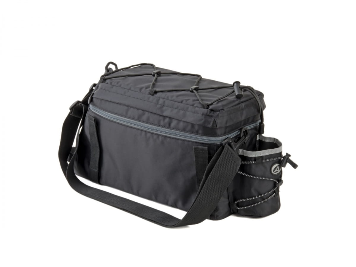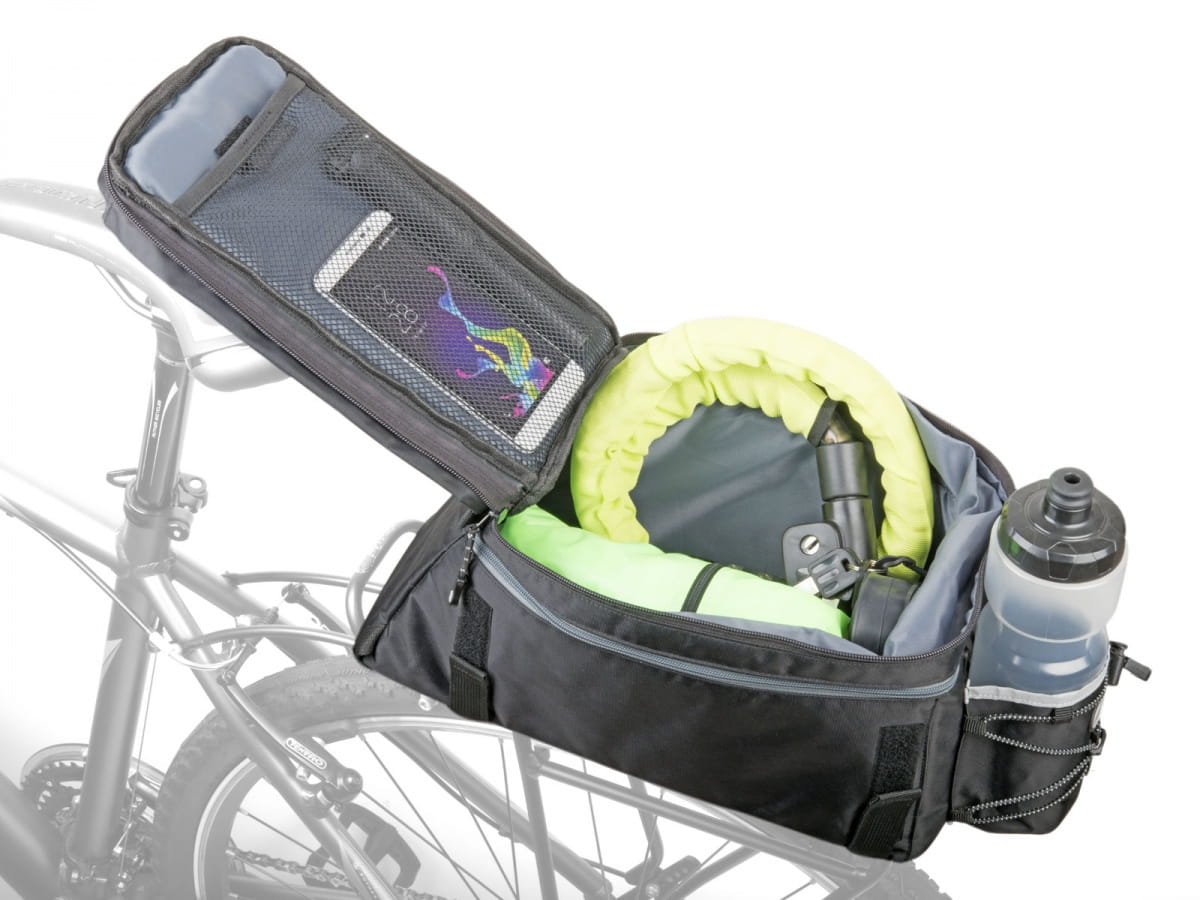 Torba na bagażnik tylny wykonana z materiału odpornego na działanie wody. Mocowana do bagażnika paskami z rzepem. Podwójne ścianki usztywnione gąbką techniczną. Komora główna zapinana na zamek. Dwie kieszenie wewnątrz i jedna kieszeń zewnętrzna. Na klapie elastyczna linka, ściągana stoperem do mocowania ubrań lub innych podręcznych przedmiotów. Możliwość zwiększenia pojemności ukrytym kominkiem poprzez odpięcie zamka. Z tyłu odblaskowa taśma zwiększająca bezpieczeństwo jazdy. W zestawie pokrowiec przeciwdeszczowy wykonany z nieprzemakalnego materiału. Pojemność: 9-14 l. Wymiary: 34 x 14 x 17 cm. Kolor: czarna.