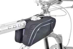 Zestaw dwóch torebek do montażu na przód ramy. Zapinane na zamek. Mocowanie do ramy za pomocą pasków z rzepem. Pojemność: 2 x 0,6 l. Wymiary: 18 x 20 x 12 cm. Kolor: czarna.