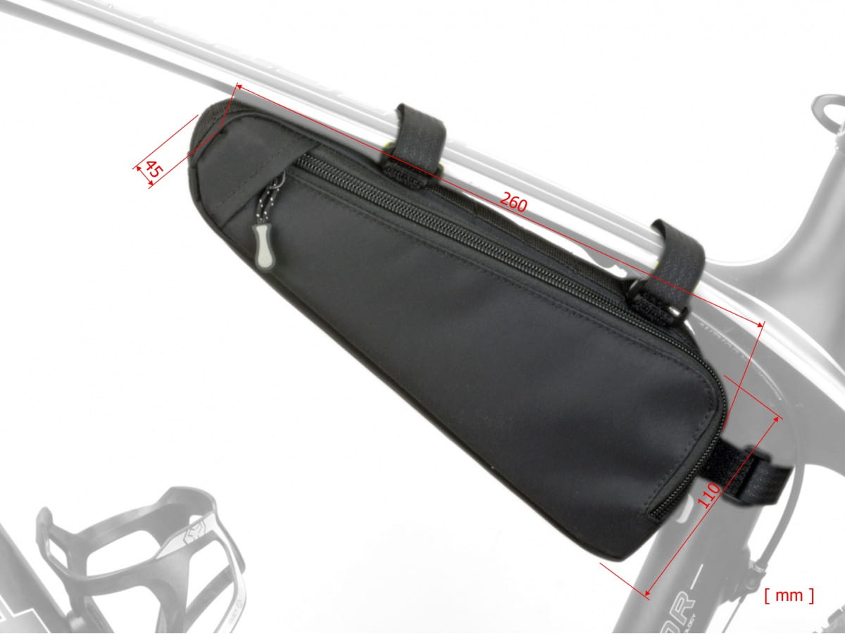 Torba trójkątna wykonana z materiału poliestrowego 420D PU odpornego na ścieranie i działanie wody. Specjalny kształt umożliwia zamocowanie torby do ramy lub sztycy. Komora główna zapinana na zasłoniety zamek z bardzo łatwym dostępem do wewnątrz. Dodatkowa kieszeń boczna na telefon komórkowy. Mocowanie do ramy za pomocą pasków z rzepem. Elementy odblaskowe dla poprawy bezpieczeństwa. Pojemność: 1,3 l. Wymiary: 26 x 11 x 4,5 cm. Kolor: czarna.