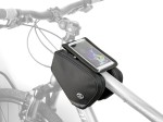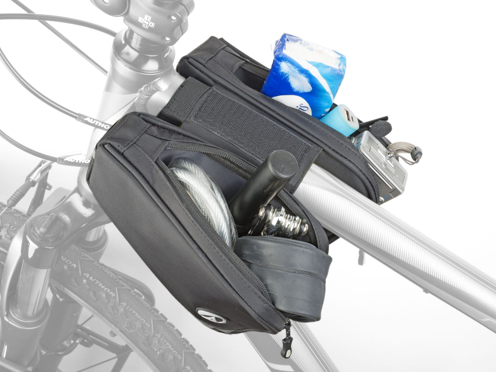 Zestaw dwóch torebek do montażu na przód ramy ze specjalnym etui na smartphone dopinanym na rzep. Zapinane na zamek. Wykonane z materiału poliestrowego 420D PU odpornego na ścieranie i działanie wody. Wewnątrz wyścielone miękką pianką. Mocowanie do ramy za pomocą pasków z rzepem. Elementy odblaskowe dla poprawy bezpieczeństwa. Wymiary pojedynczej torebki: 20 x 4 x 14 cm. Wymiary etui na smartphone: 16 x 9 cm.