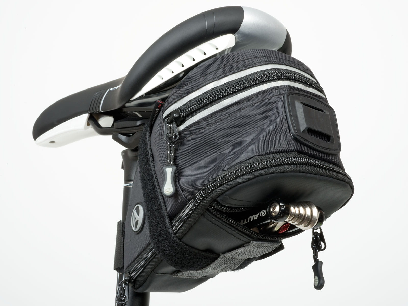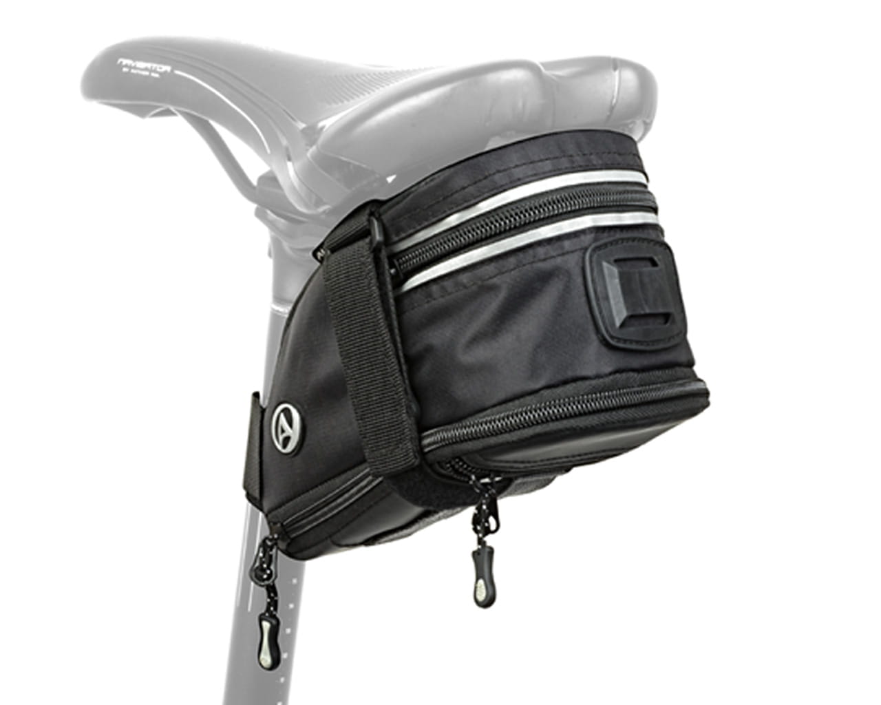 Torba podsiodłowa z materiału odpornego na ścieranie i działanie wody. Zwiększanie pojemności ukrytym kominkiem poprzez odpięcie zamka. W dolnej części zewnętrzna kieszonka na drobiazgi oraz naszyte płaskie gumy do przytroczenia drobnych przedmiotów. Przypinana paskami z rzepem do stelaża siodełka oraz do wspornika siodełka. Odblaskowe elementy. Możliwość zamontowania lampki tylnej. Pojemność: 1,5 + 0,7 l. Wymiary: 19 x 12 x 10 cm. Kolor: czarna.