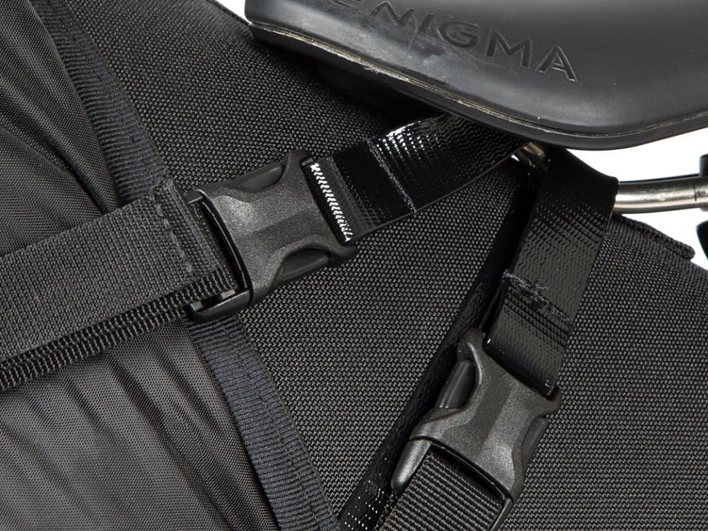 - dwuczęściowy system pozwala na szybkie wyjmowanie wodoszczelnego worka (drybag), podczas gdy uprząż pozostaje przymocowana do roweru, co znacząco ułatwia pakowanie i rozpakowywanie