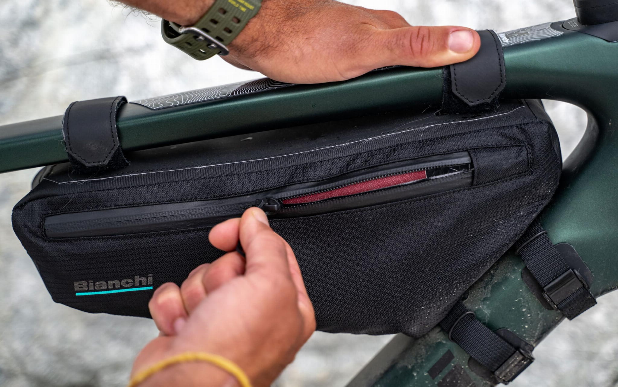 Torebka montowana w środku ramy roweru, co umożliwia łatwy dostęp do telefonu, kluczy, portfela czy przekąsek bez konieczności schodzenia z roweru. Dzięki minimalistycznemu i eleganckiemu designowi w stylu Bianchi, idealnie komponuje się z rowerami tej marki.