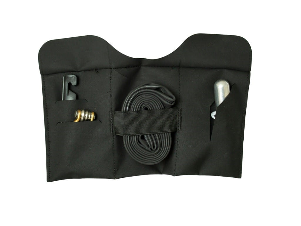 - wewnątrz znajdują się cztery przegródki na narzędzie wielofunkcyjne, łyżki do opon i naboje CO2, a także torebkę na spinkę do łańcucha lub inne drobne części, jest też elastyczna taśma na dowolną dętkę