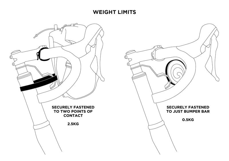- rekomendowana nośność: 2,5 kg dla toreb zawieszonych na kierownicy, 0,5 dla akcesoriów zamocowanych bezpośrednio na uchwycie Bumper