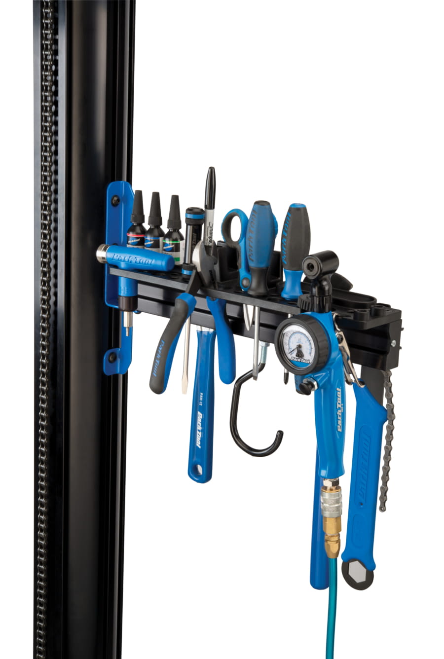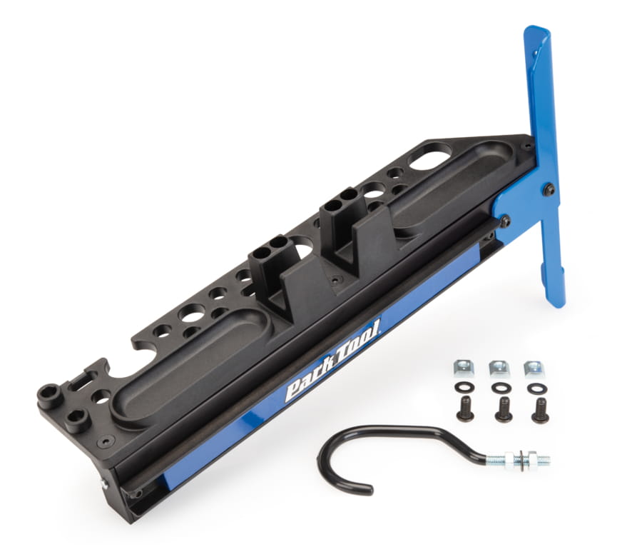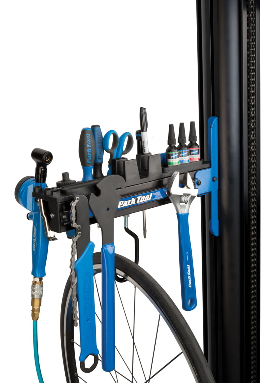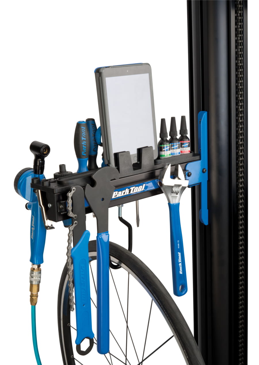 Podstawka na narzędzia, małe części, oleje i smary montowana do stojaka PRS-33 lub PRS-33.2. 19 różnych otworów na narzędzia o różnych kształtach i rozmiarach. W zestawie znajduje się również hak do zawieszenia koła. Podstawka wyposażona w otwory do montażu uchwytu na ręczniki papierowe PTH-1. Długośc 35 cm. Uchwyt na telefon lub tablet.